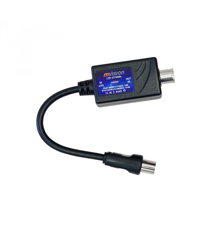 Φίλτρο 4G-LTE [5 -774 ΜΗΖ], με σύνδεση βύσματος TV εισόδου - εξόδου σήματος, με αμφίδρομο πέρασμα τηλεοπτικού σήματος και DC. Για απόρριψη συχνοτήτων 4G-LTE (καναλι 58) απο το τηλεοπτικό σήμα. Με προέκταση καλωδίου. Συσκευασία: ατομικό πλαστικό.