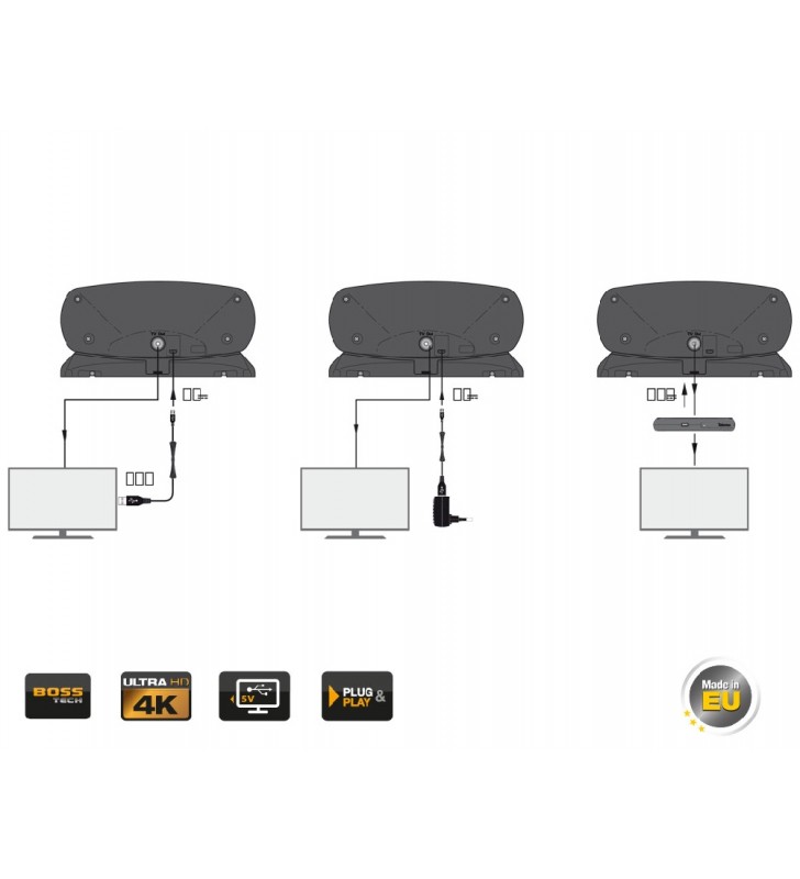 Η κεραία λήψης επίγειου ψηφιακού τηλεοπτικού σήματος TELEVES 130240 INNOVA BOSS TFORCE LTE έιναι μια "έξυπνη" κεραία για τοποθέτηση σε εσωτερικό χώρο, με πανεύκολη Plug & Play τοποθέτηση και λειτουργία. Παρέχει πολυκατευθυντική λήψη και δέν χρειάζεται συναρμολόγηση, ρυθμίσεις και προσανατολισμό κατεύθυνσης λήψης. Με παροχή τροφοδοσίας* ενεργοποιείται η τεχνολογία BOSS TFORCE της Televes και παρέχει συνεχή επίβλεψη και αυτορύθμιση του σήματος εξόδου της, παρέχοντας το ιδανικό σήμα κάθε στιγμή στην τηλεόραση. Η τεχνολογία BOSS TFORCE ενεργοποιείται μέσω σύνδεσης του microUSB (περιέχεται) καλωδίου, σε φορτιστή smartphone ή στο USB της τηλεόρασης για παροχή ρεύματος 5 βόλτ. Επίσης, μπορεί να ενεργοποιηθεί και με παροχή ρεύματος 12 βόλτ μέσω του ομοαξονικού καλωδίου, απο τον δέκτη ή απο τροφοδοτικό κεραίας 12 βόλτ. Ο σύγχρονος σχεδιασμός και η κατασκευή των κυκλωμάτων της, επιτρέπει μέγιστο δυναμικό εύρος λήψης και σταθερή απόδοση, ακόμα και σε σημεία με πολύ ασθενές ή πολύ ισχυρό σήμα. Μπορεί να χρησιμοποιηθεί και με παθητική λειτουργία, απλά συνδέοντας την στην είσοδο κεραίας της τηλεόρασης, αλλά χωρίς επεξεργασία και βελτίωση του σήματος.