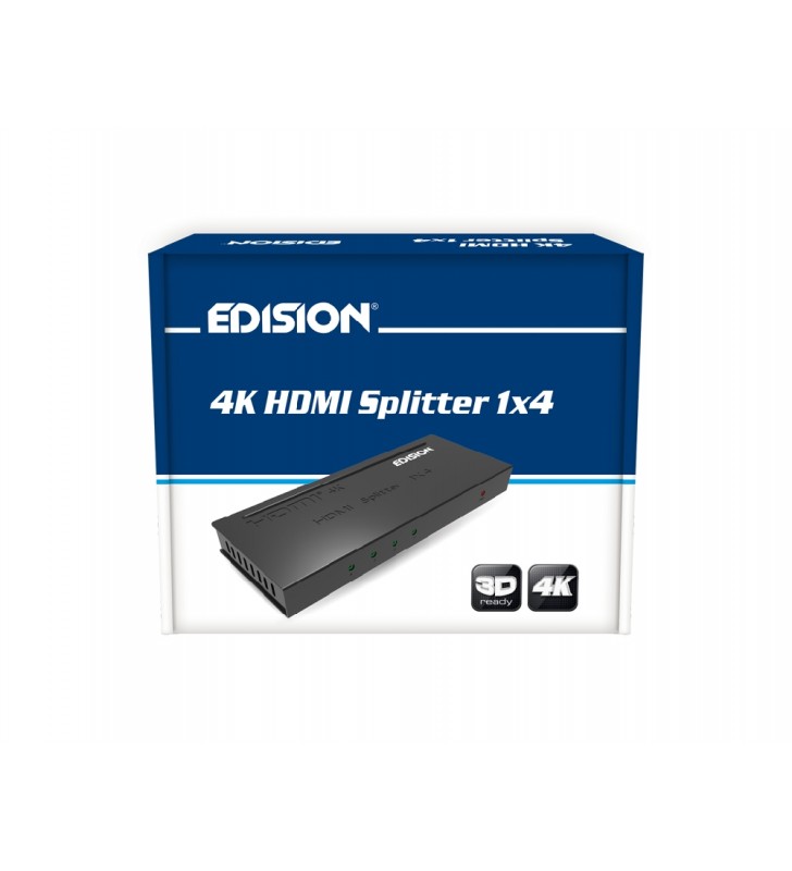 Το EDISION 4K HDMI Splitter 1x4 χρησιμοποιεί μια πηγή HDMI, και την μοιράζει προς 4 συμβατές οθόνες ή projectors με HDMI είσοδο. Μπορεί επίσης να τοποθετηθεί στο τέλος ενός καλωδίου HDMI για την αναγέννηση του σήματος HDMI, ενώ έχει την δυνατότητα να μεταφέρει ανάλυση έως 3840 x 2160 / 30Hz.