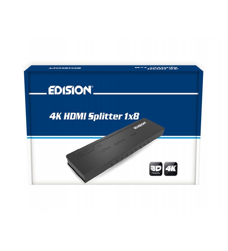 Το EDISION 4K HDMI Splitter 1x8 χρησιμοποιεί μια πηγή HDMI, και την μοιράζει προς 8 συμβατές οθόνες ή projectors με HDMI είσοδο. Μπορεί επίσης να τοποθετηθεί στο τέλος ενός καλωδίου HDMI για την αναγέννηση του σήματος HDMI, ενώ έχει την δυνατότητα να μεταφέρει ανάλυση έως 3840 x 2160 / 30Hz.